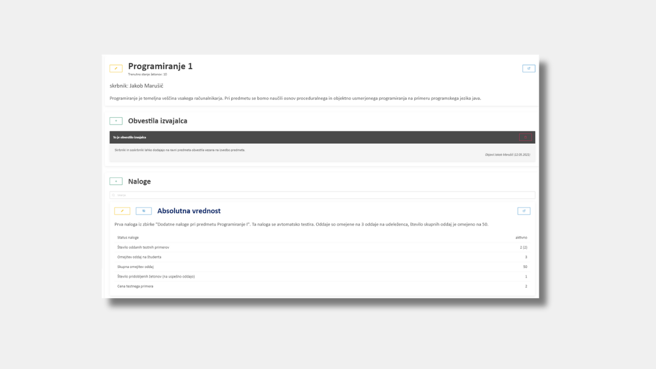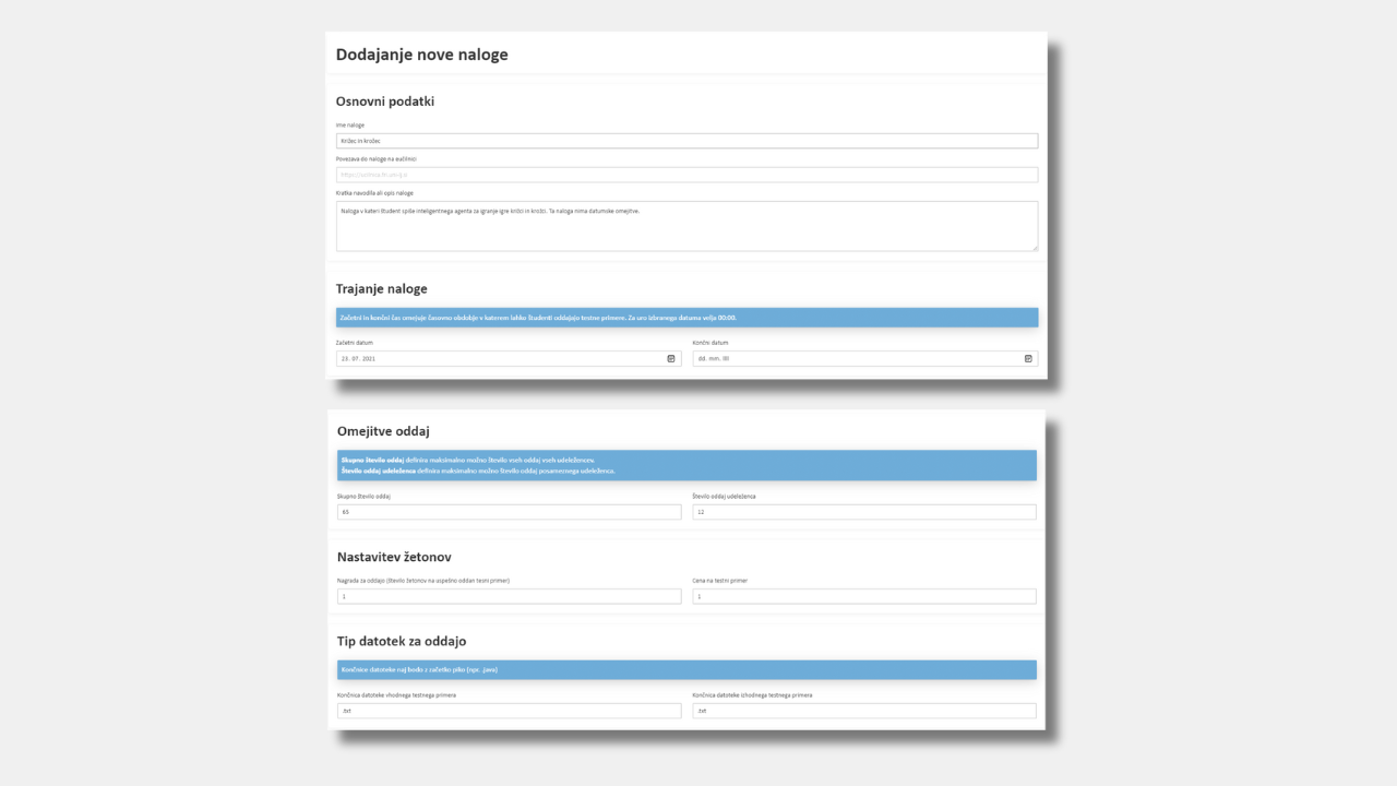 Motivacija za nalogo izhaja iz potrebe po večjem nadzoru nad kakovostjo testnih primerov, saj so le-ti ključni za preverjanje znanja študentov. V trenutnem sistemu je priprava testnih primerov pogosto neenakomerno porazdeljena, kar vodi do neenakomerne obremenitve med študenti in pedagoškimi delavci. Poleg tega se pogosto pojavljajo težave z nepravilnimi ali ponavljajočimi se testnimi primeri, kar zmanjšuje učinkovitost učenja.