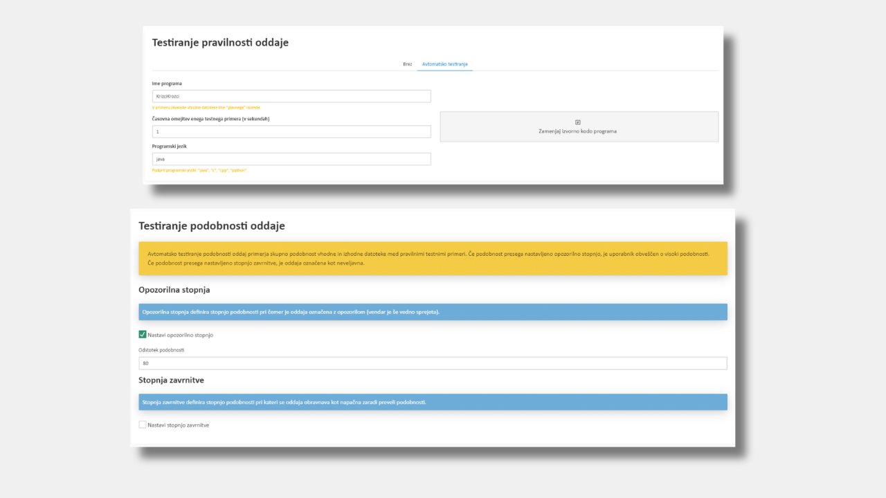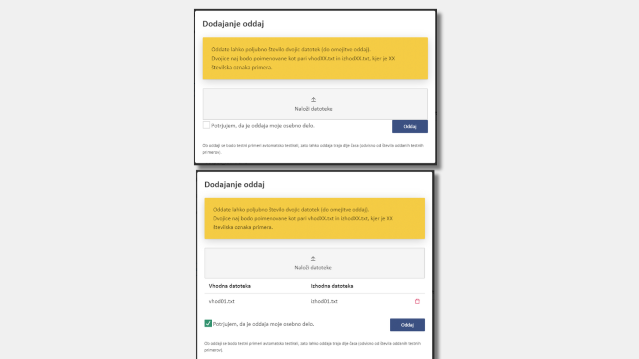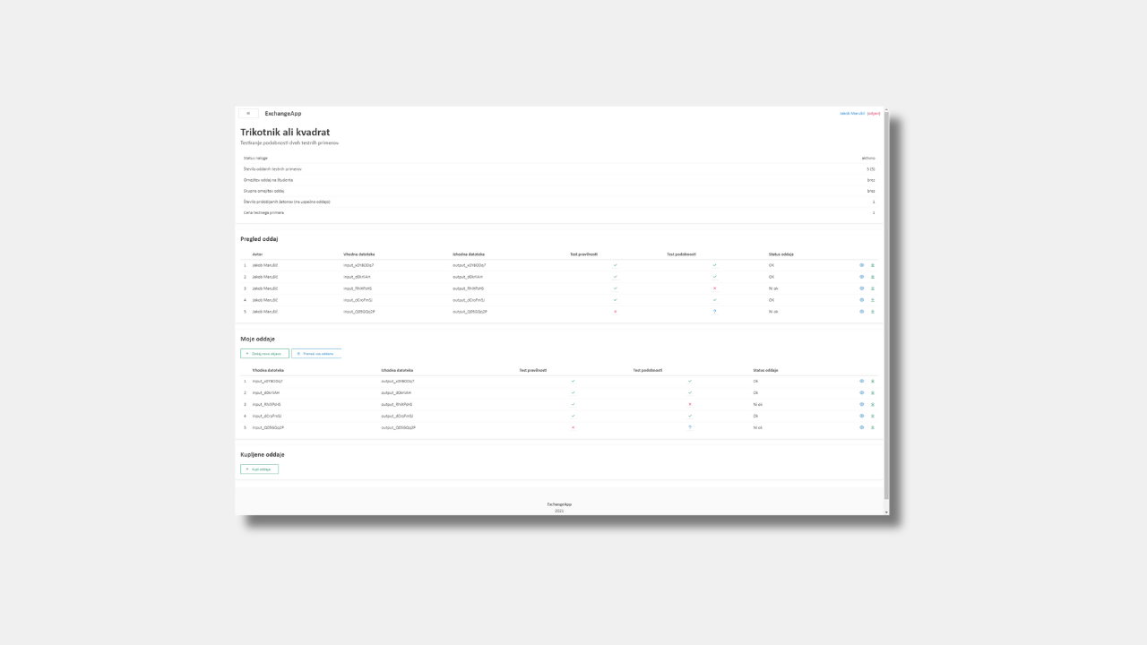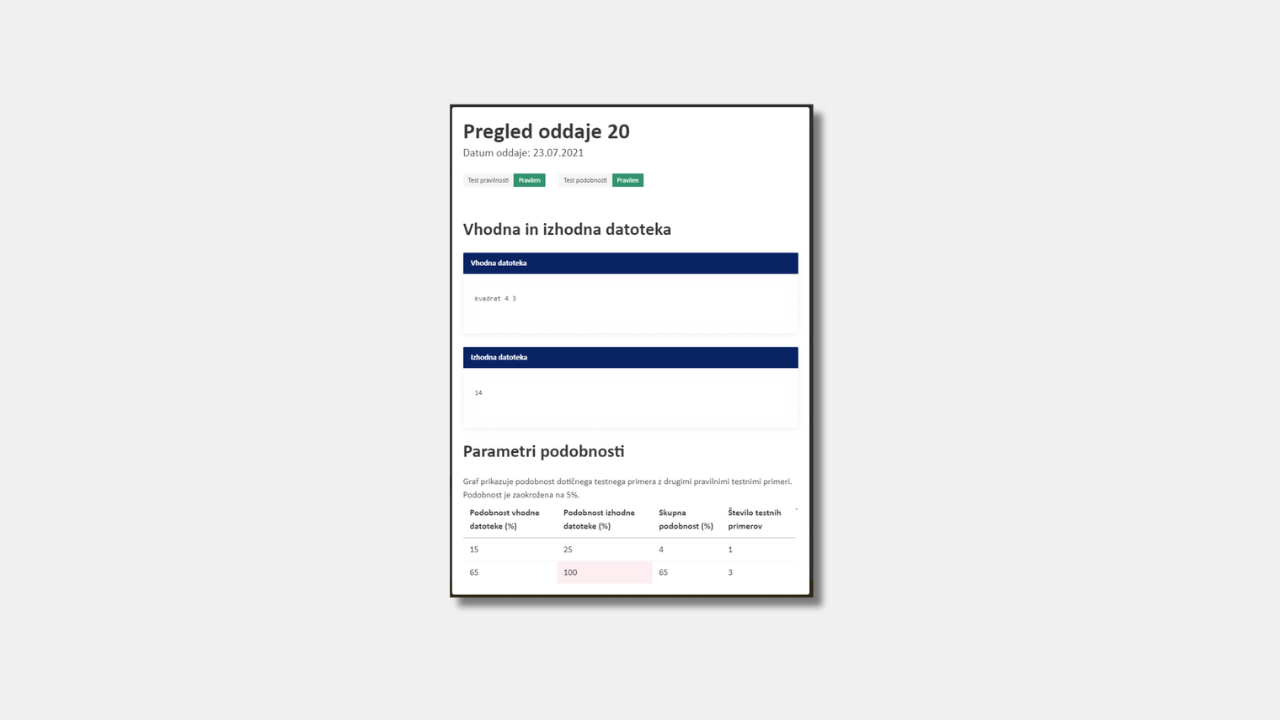 Cilj diplomske naloge je bil razviti sistem, ki bi omogočil enostavno izmenjavo testnih primerov med študenti, s čimer bi se izboljšala kakovost testiranja in pravična delitev bremena priprave testnih primerov. Sistem naj bi omogočal tudi avtomatsko preverjanje pravilnosti in podobnosti testnih primerov, kar bi dodatno prispevalo k izboljšanju kakovosti izobraževalnega procesa.